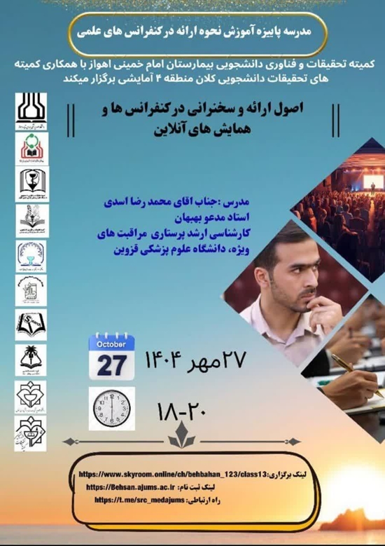 کمیته تحقیقات و فناوری دانشجویی بیمارستان امام خمینی (ره) اهواز با همکاری کمیته های تحقیقات و فناوری دانشجویی کلان منطقه ۴ آمایشی برگزار می کند: