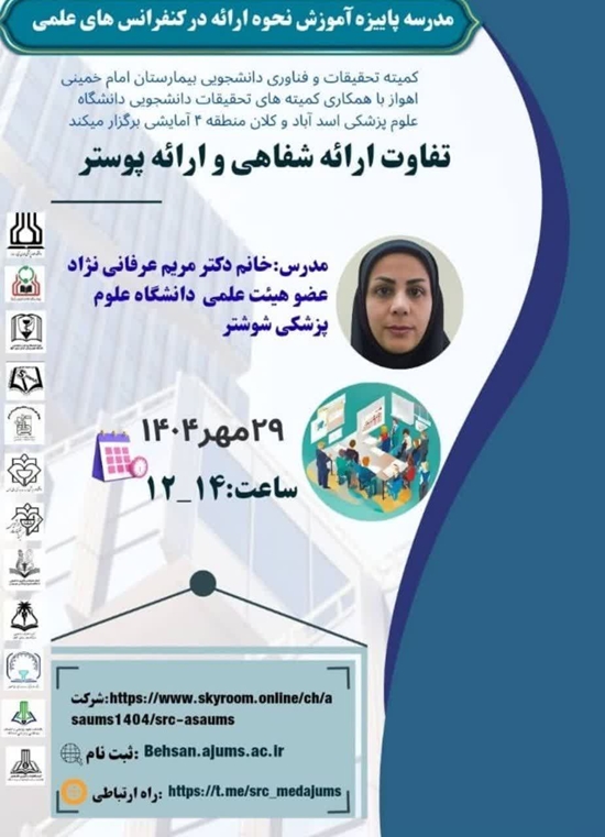 کمیته تحقیقات و فناوری دانشجویی بیمارستان امام خمینی (ره) اهواز با همکاری کمیته های تحقیقات و فناوری دانشجویی دانشگاه علوم پزشکی اسد آباد و کلان منطقه ۴ آمایشی برگزار می کند: