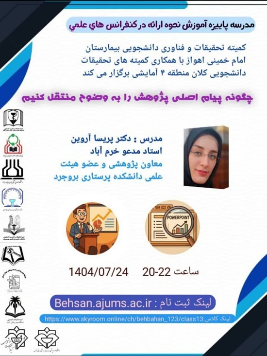 کمیته تحقیقات و فناوری دانشجویی بیمارستان امام خمینی (ره) اهواز با همکاری کمیته های تحقیقات و فناوری دانشجویی کلان منطقه ۴ آمایشی برگزار می کند: