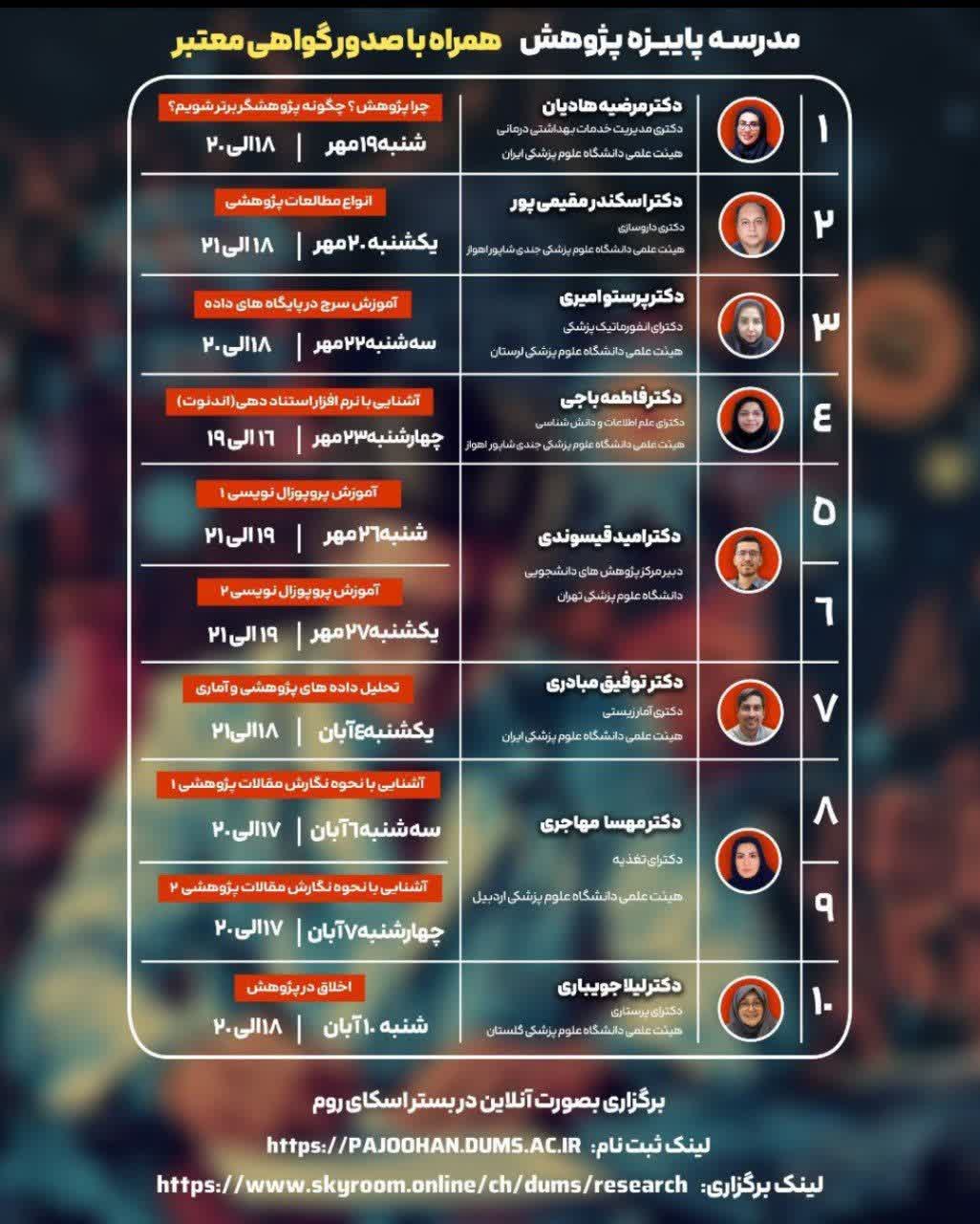����چرا پژوهش؟ چگونه پژوهشگر برتر شویم؟ مدرس: دکتر مرضیه هادیان ����انواع مطالعات پژوهشی مدرس: دکتر اسکندر مقیمی پور ����آموزش سرچ در پایگاه های داده مدرس: دکتر پرستو امیری ����آشنایی با نرم افزار استناد دهی (اندنوت) مدرس: دکتر فاطمه باجی ����آموزش پروپوزال نویسی۱و۲ مدرس: دکتر امید قیسوندی ����تحلیل داده های پژوهشی و آماری مدرس: دکتر توفیق مبادری ����آشنایی با نحوه نگارش مقالات پژوهشی۱و۲ مدرس: دکتر مهسا مهاجری ����اخلاق در پژوهش مدرس: پروفسور لیلا جویباری