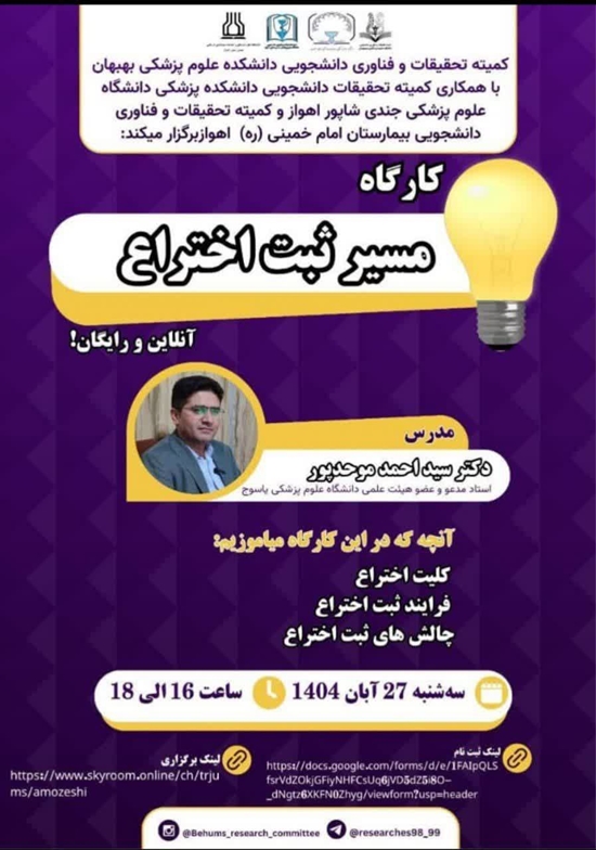 مدرس: ��������‍����دکتر سید احمد موحد پور ����استاد مدعو و عضو هیئت علمی دانشگاه علوم پزشکی یاسوج آنچه در این کارگاه میاموزیم: ����کلیت ثبت اختراع ����فرآیند ثبت اختراع ����چالش های ثبت اختراع ����سه شنبه ۲۷آبان ماه ۱۴۰۴ ⏰ساعت ۱۶ الی ۱۸