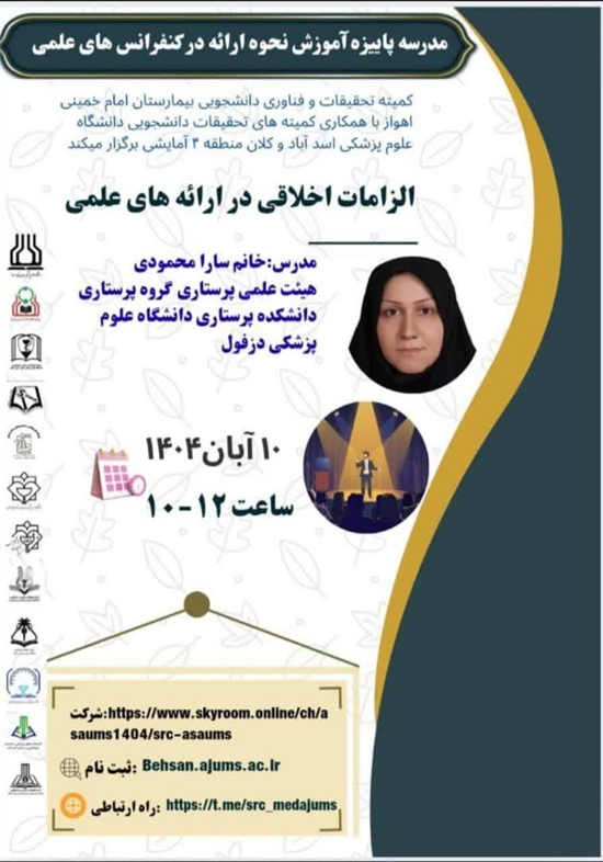 کمیته تحقیقات و فناوری دانشجویی بیمارستان امام خمینی (ره) اهواز با همکاری کمیته های تحقیقات و فناوری دانشجویی دانشگاه علوم پزشکی اسد آباد و کلان منطقه ۴ آمایشی برگزار می کند: