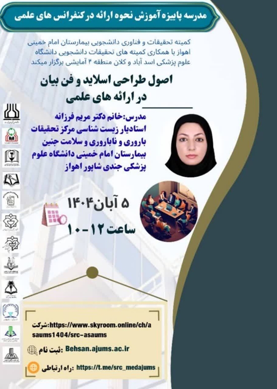 کمیته تحقیقات و فناوری دانشجویی بیمارستان امام خمینی (ره) اهواز با همکاری کمیته های تحقیقات و فناوری دانشجویی دانشگاه علوم پزشکی اسد آباد و کلان منطقه ۴ آمایشی برگزار می کند: