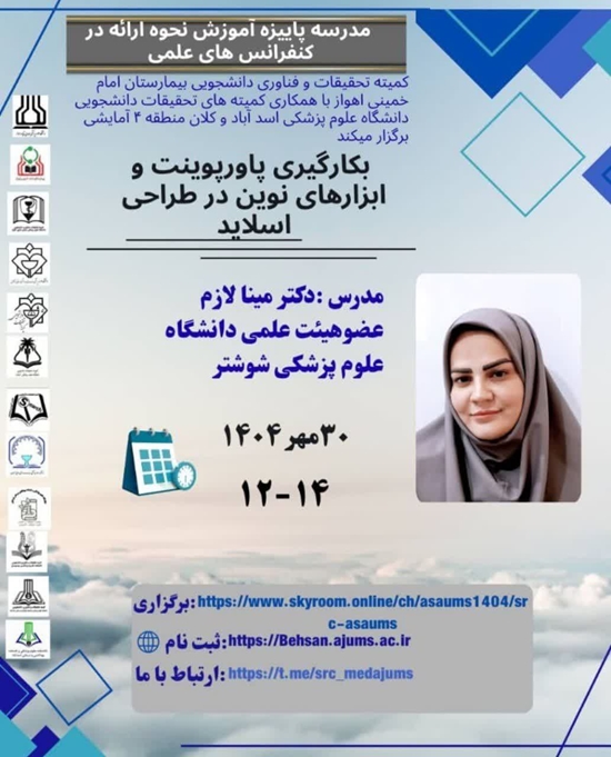 کمیته تحقیقات و فناوری دانشجویی بیمارستان امام خمینی (ره) اهواز با همکاری کمیته های تحقیقات و فناوری دانشجویی دانشگاه علوم پزشکی اسد آباد و کلان منطقه ۴ آمایشی برگزار می کند: