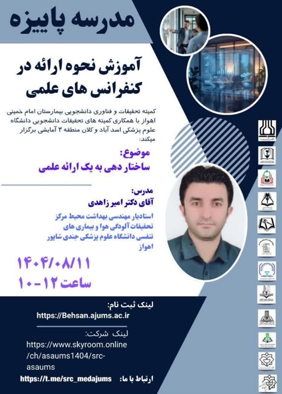 کمیته تحقیقات و فناوری دانشجویی بیمارستان امام خمینی (ره) اهواز با همکاری کمیته های تحقیقات و فناوری دانشجویی دانشگاه علوم پزشکی اسد آباد و کلان منطقه ۴ آمایشی برگزار می کند: