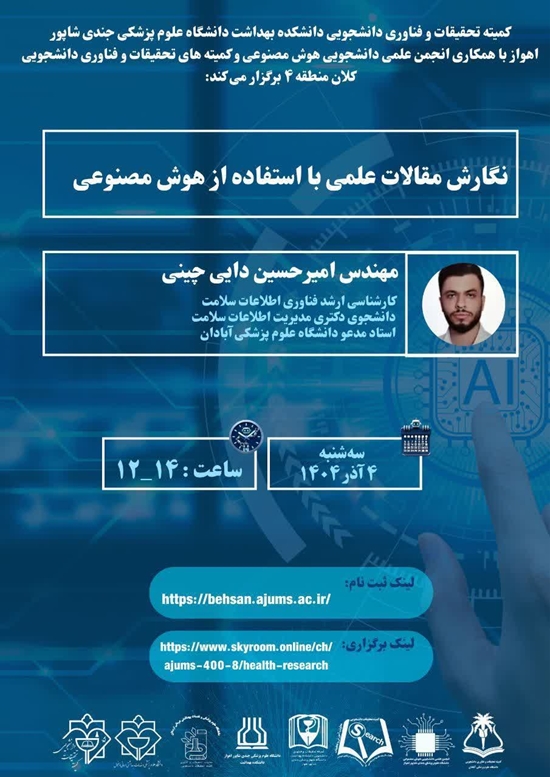 کمیته تحقیقات و فناوری دانشجویی دانشکده بهداشت دانشگاه علوم پزشکی جندی شاپور اهواز با همکاری انجمن علمی دانشجویی هوش مصنوعی دانشگاه علوم پزشکی جندی شاپور اهواز و کمیته های تحقیقات و فناوری دانشجویی دانشکده و دانشگاه های لرستان، دزفول، شوشتر، آبادان برگزار می‌کند: