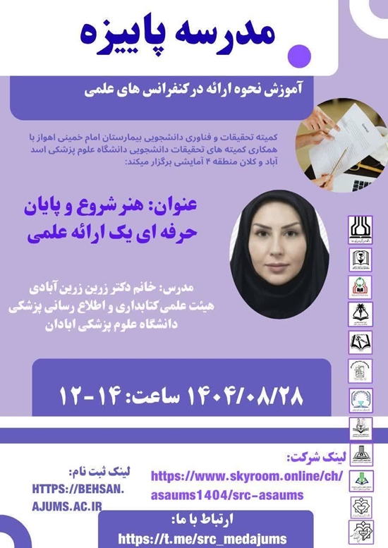 کمیته تحقیقات و فناوری دانشجویی بیمارستان امام خمینی (ره) اهواز با همکاری  کمیته های تحقیقات و فناوری دانشجویی دانشگاه علوم پزشکی اسد آباد و کلان منطقه ۴ آمایشی  برگزار می کند: