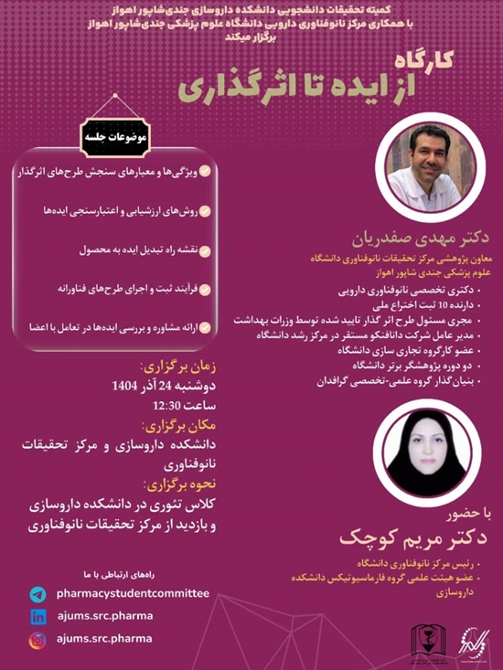 ⭕️ کمیته تحقیقات دانشجویی دانشکده داروسازی دانشگاه علوم پزشکی جندی شاپور اهواز با همکاری مرکز نانوفناوری دارویی دانشگاه علوم پزشکی جندی شاپور برگزار میکند : ⭕️