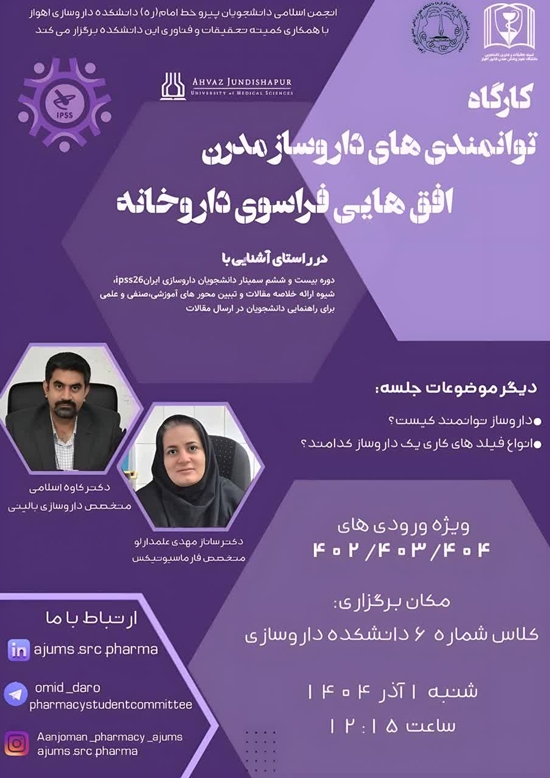 انجمن اسلامی دانشجویان پیرو خط امام(ره) دانشکده داروسازی اهواز با همکاری کمیته تحقیقات دانشجویی این دانشکده برگزار می‌کند: