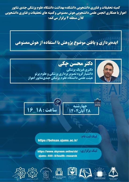 ⭕️کمیته تحقیقات دانشجویی دانشکده بهداشت علوم پزشکی جندی شاپور اهواز با همکاری انجمن علمی دانشجویی هوش مصنوعی و کمیته های تحقیقات و فناوری دانشجویی کلان منطقه 4 آمایشی برگزار میکند : ⭕️